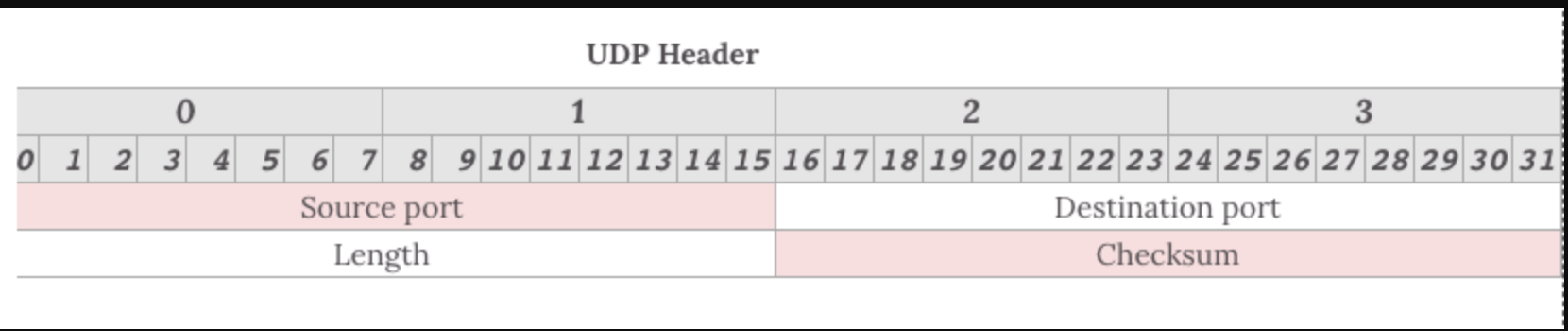 • 两个十六位的端口号,分别为源端口(可选字段)和目标端口 整个数据报文的长度