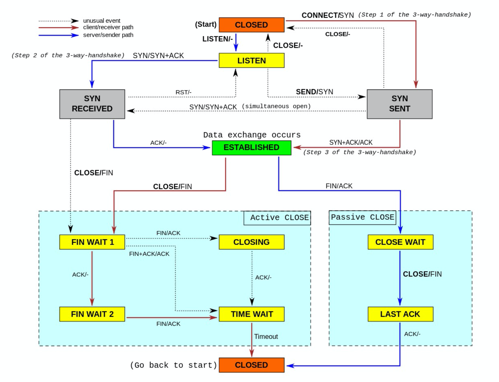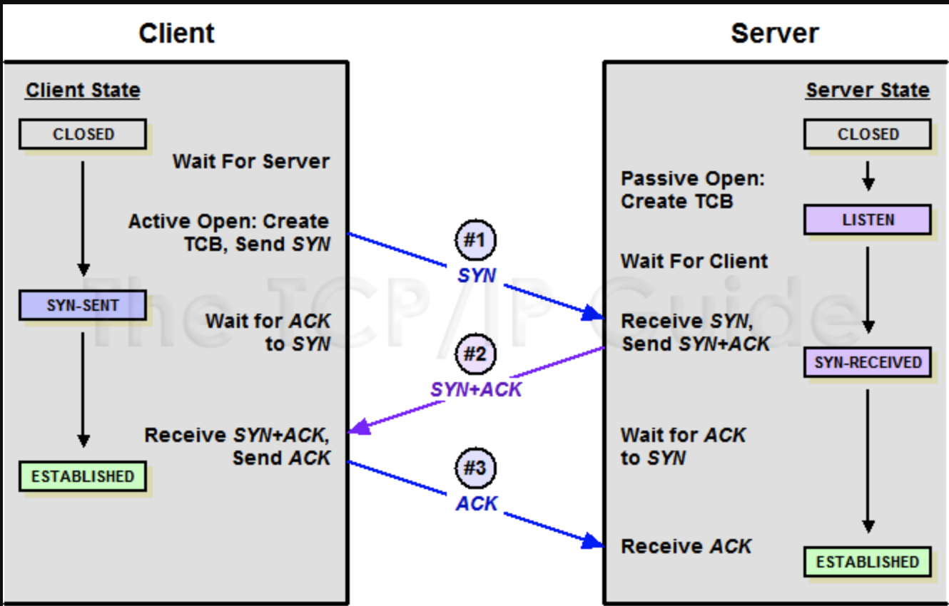 • 起初,两端都为 CLOSED 状态。在通信开始前,双方都会创建 TCB。 服务器创建完 TCB 后遍进入 LISTEN 状态,此时开始等待客户端发送数据