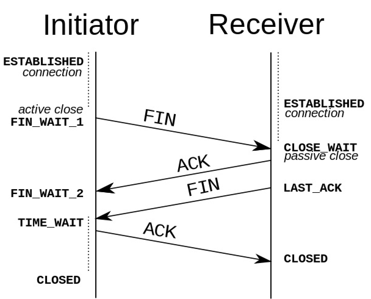 • A 收到释放请求后,向 B 发送确认应答,此时 A 进入 TIME-WAIT 状态。该状态会持续 2MSL(最大段生存期,指报文段在网络中生存的时间,超时会被抛弃) 时间,若该时间段内没有 B 的重发请求的话,就进入 CLOSED 状态。当 B 收到确认应答后,也便进入 CLOSED 状态。