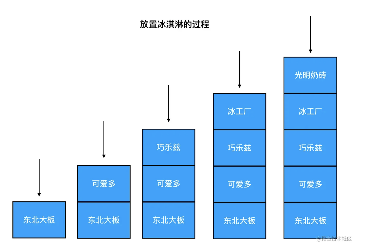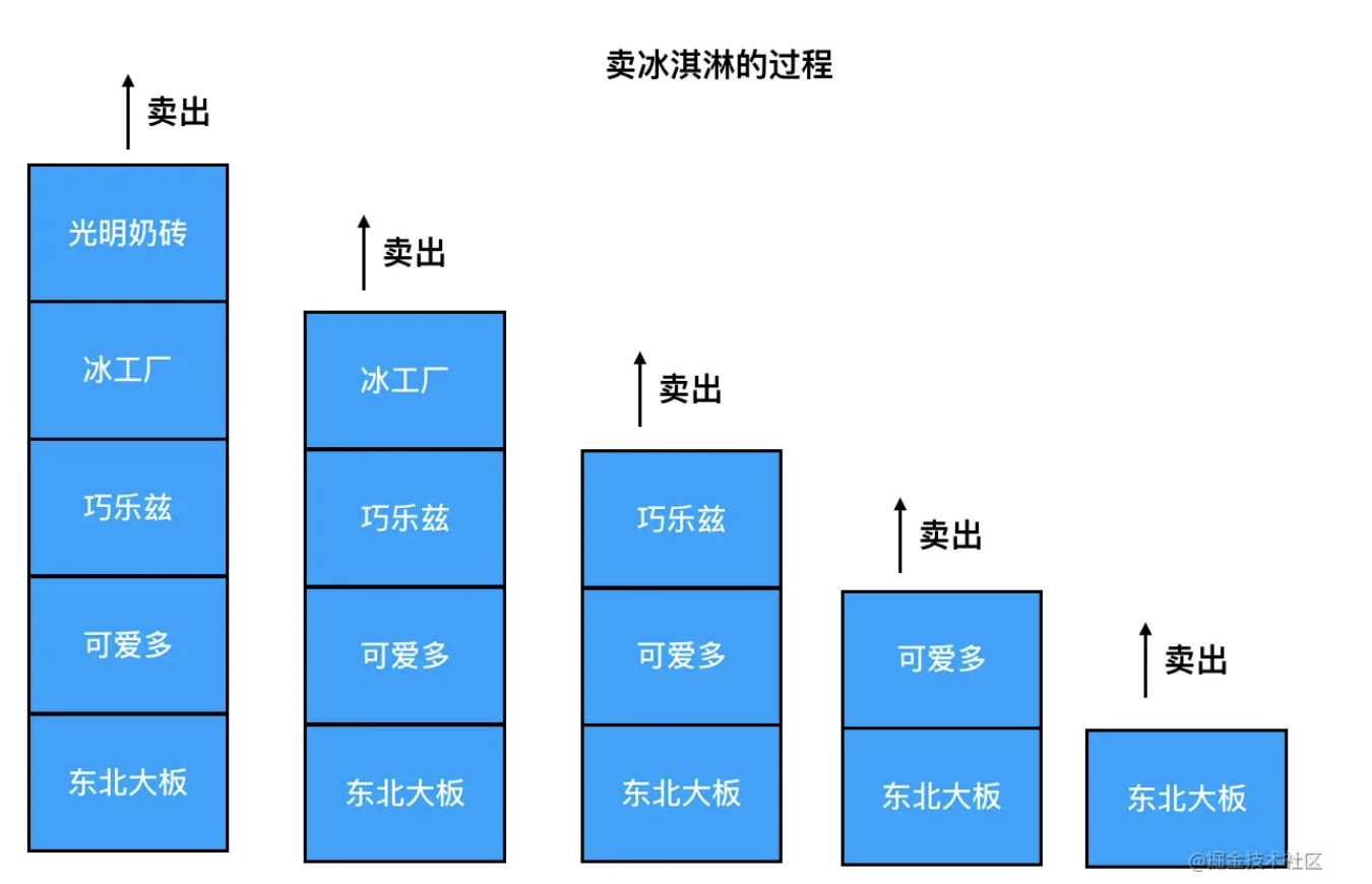 小卖部老板往里面摆置冰淇淋的时候,最先摆进去的会落在冰柜的底部,最后摆置进去的留在冰柜的顶部。如果这时候咱们去买冰淇淋,老板就会把冰柜顶部的那个取出来给我们。在冰淇淋不断被取出的这个过程里,越是后来放进去的,越是先被取出来;越是先放进去的,越是最后被取出来。这个过程,就是所谓的“后进先出”: