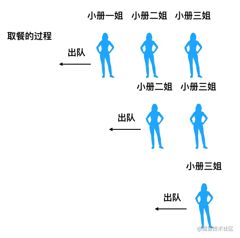 把上面代码丢进控制台运行,我们可以看到小册姐一个接一个地乖乖去取餐了: