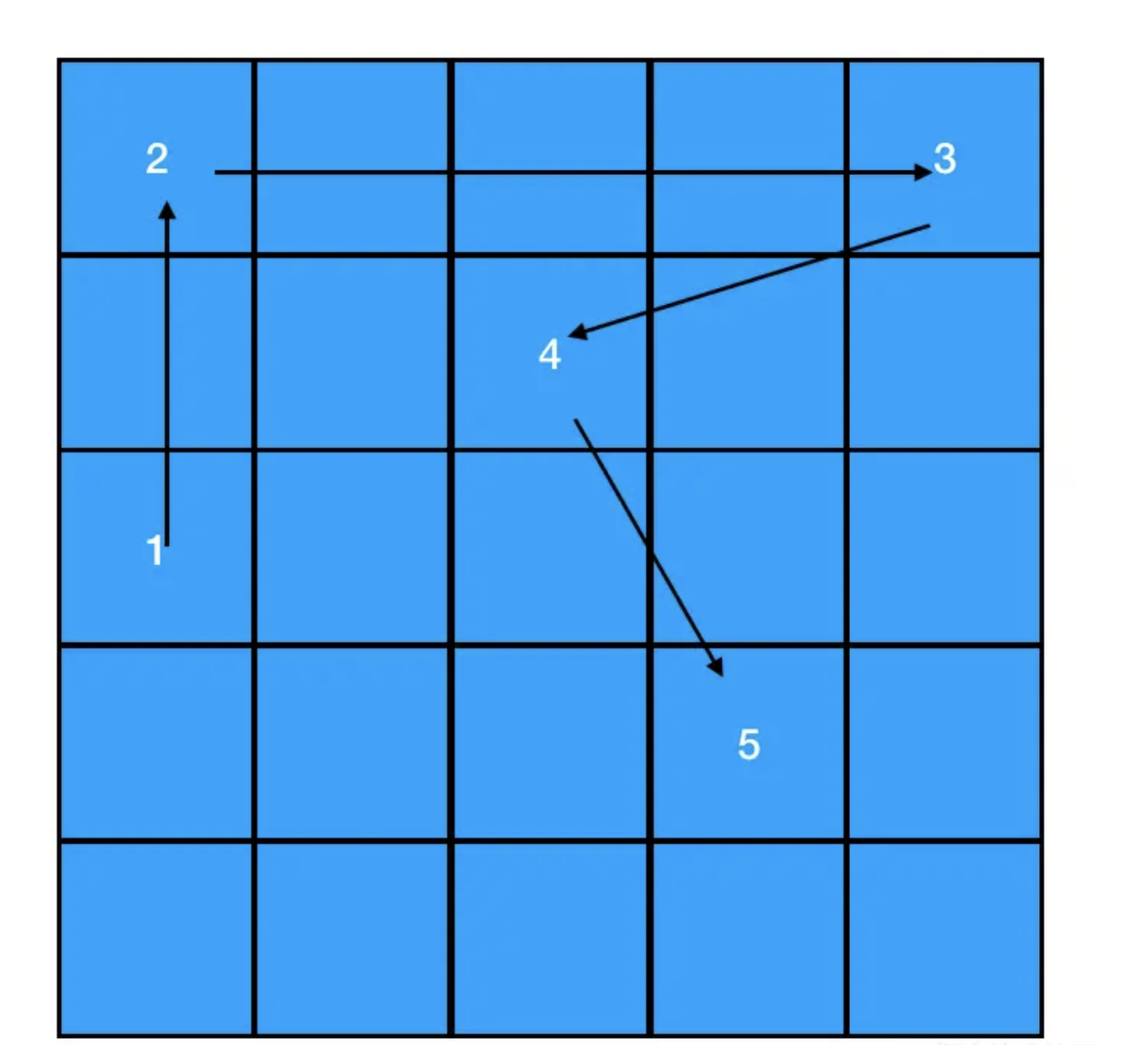 而链表中的结点,则允许散落在内存空间的各个角落里。一个内容为1->2->3->4->5的链表,在内存中的形态可以是散乱如下的: