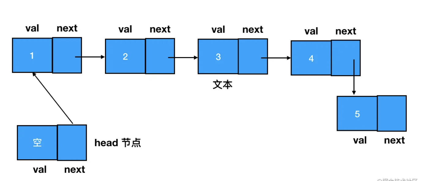 要想访问链表中的任何一个元素,我们都得从起点结点开始,逐个访问 next,一直访问到目标结点为止。为了确保起点结点是可抵达的,我们有时还会设定一个 head 指针来专门指向链表的开始位置: