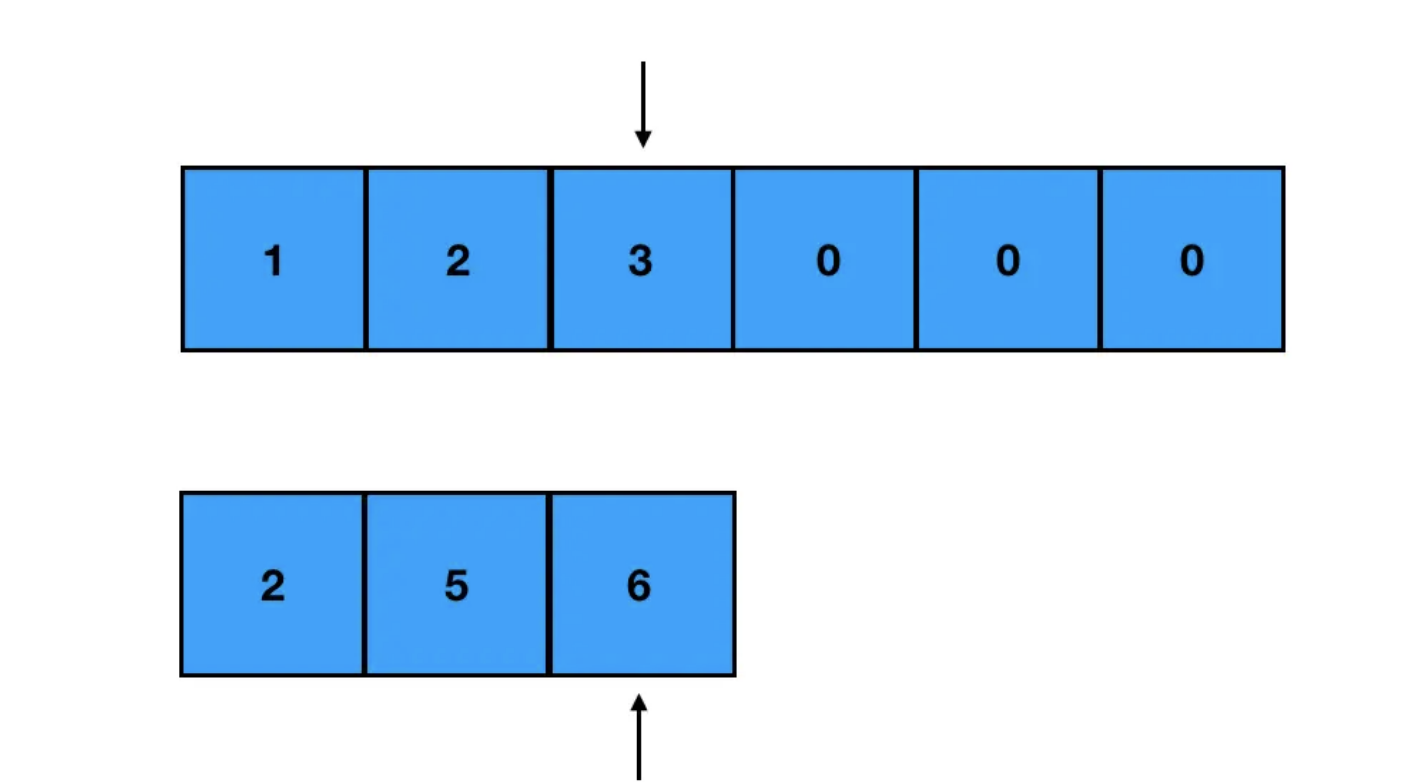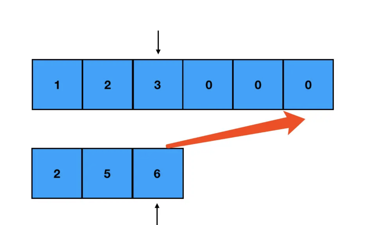 这道题没有太多的弯弯绕绕,标准解法就是双指针法。首先我们定义两个指针,各指向两个数组生效部分的尾部: