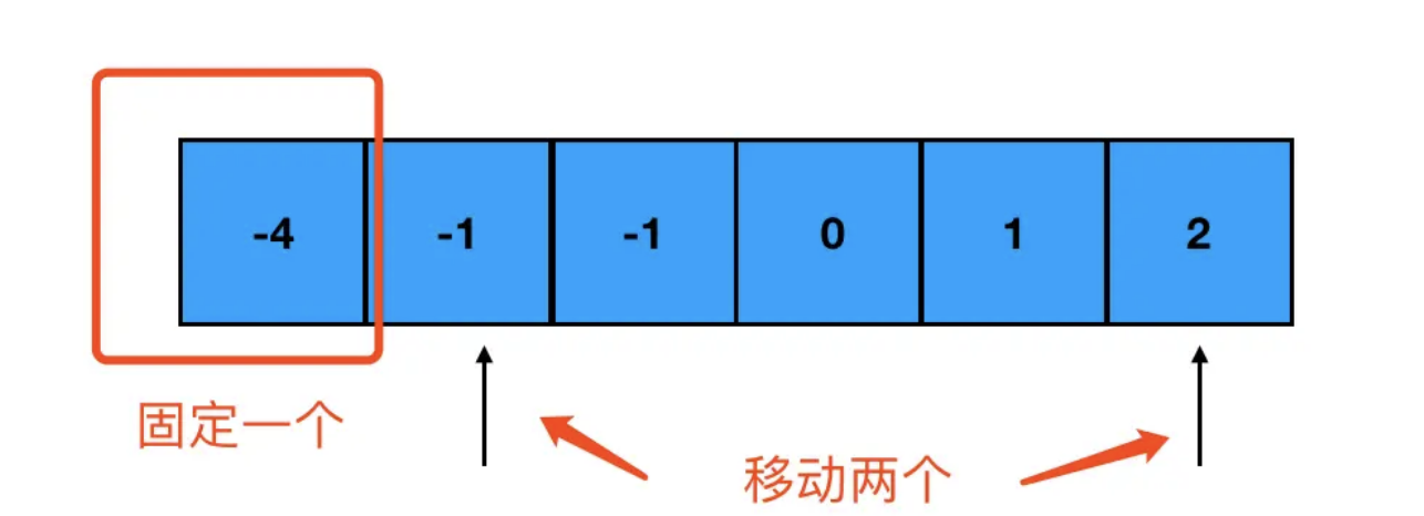 tips:这个数组在题目中要求了“不重复的三元组”,因此我们还需要做一个重复元素的跳过处理。这一点在编码实现环节大家会注意到。