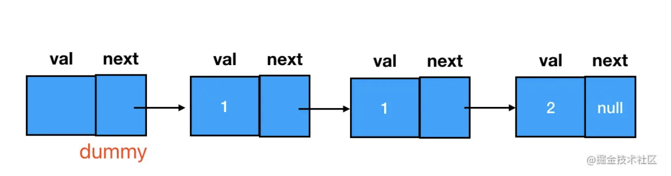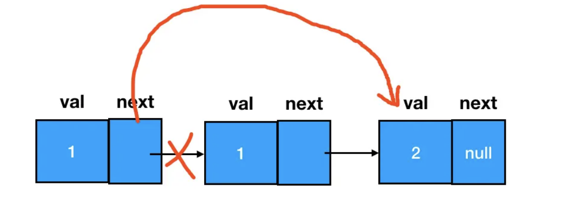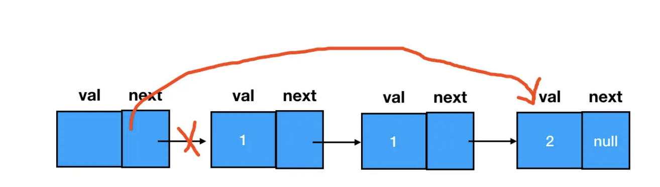 这样一来,如果想要删除两个连续重复的值为 1 的结点,我们只需要把 dummy 结点的 next 指针直接指向 2: