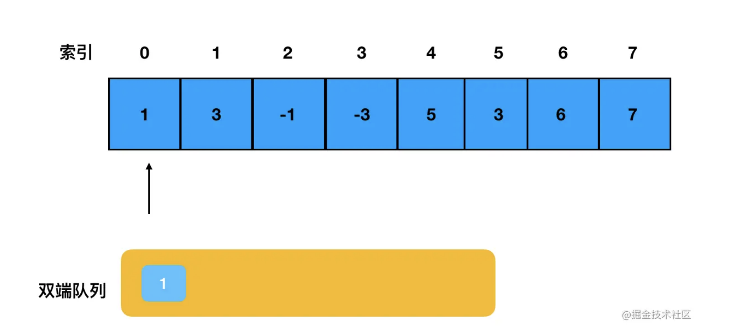 在遍历数组的前期,我们尝试将遍历到的每一个元素都推入队列内部(下图是第一个元素入队的示意图):