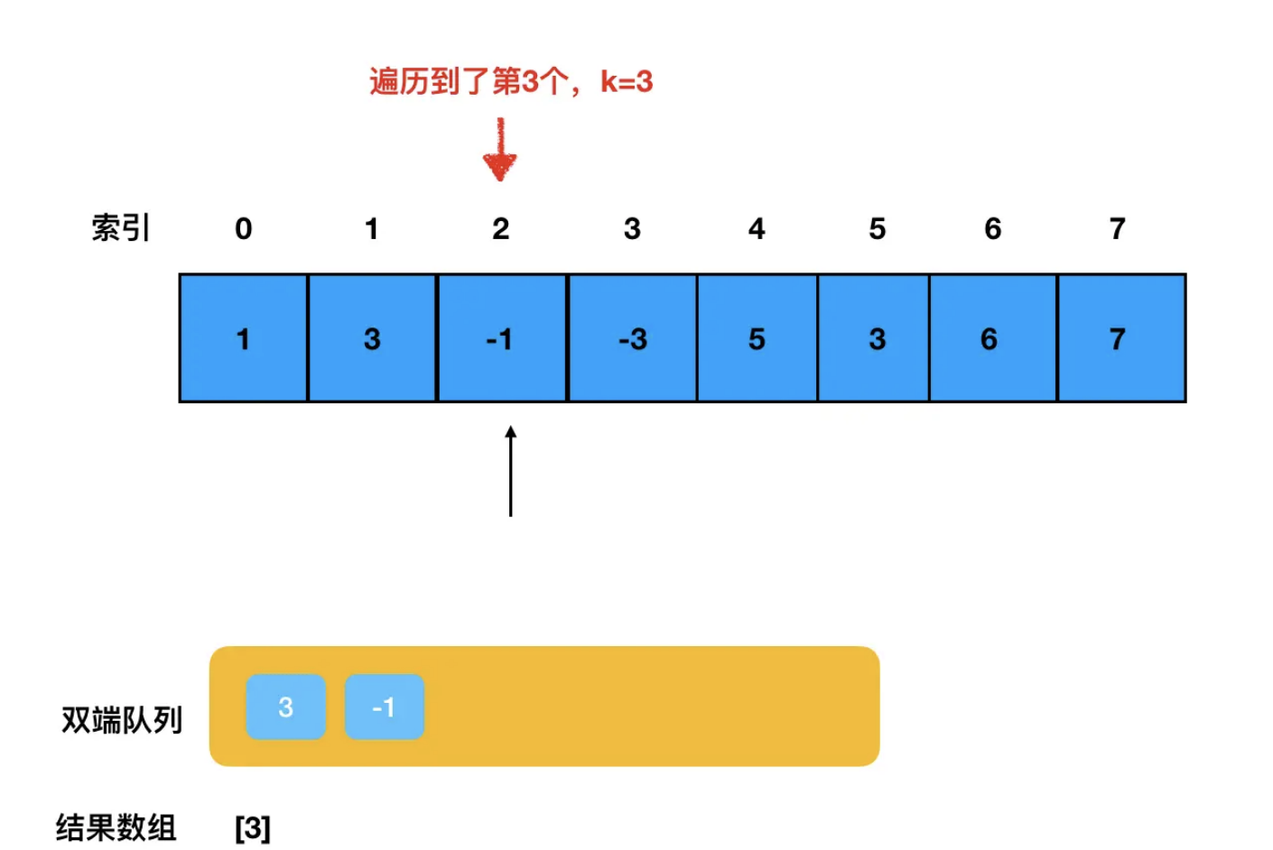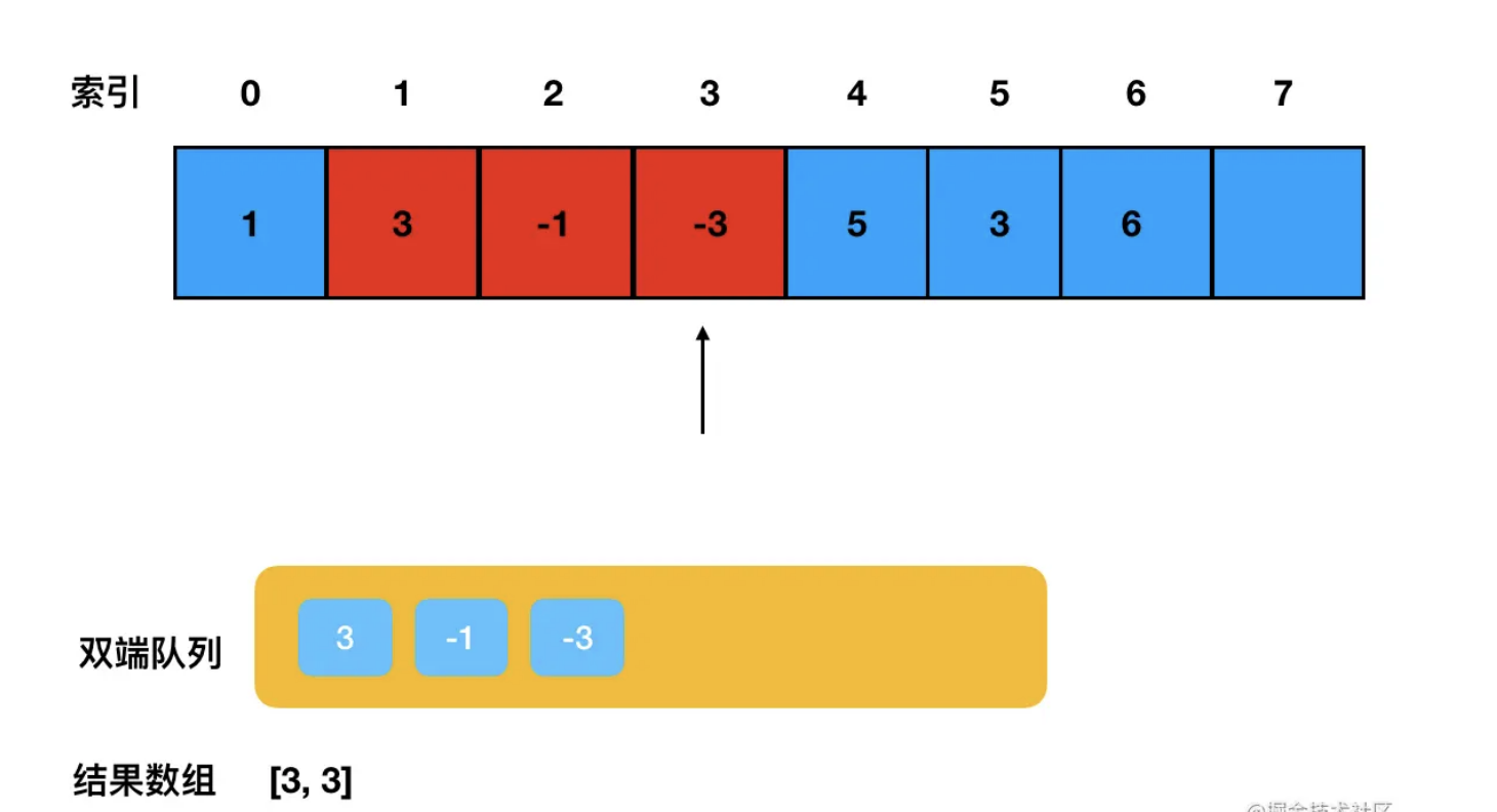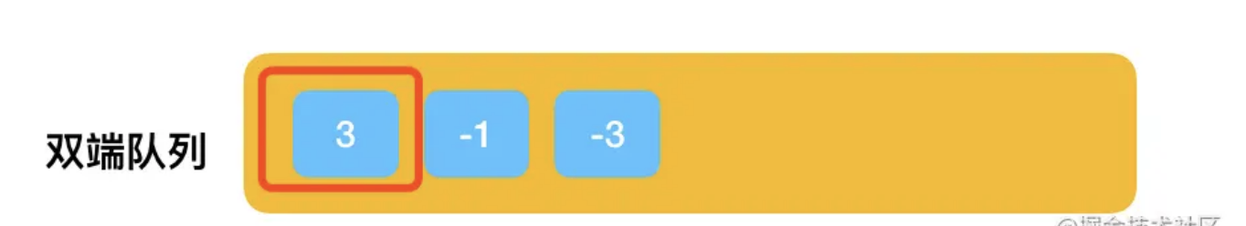 此时滑动窗口内的元素少了一个 1,增加了一个 -3——减少的数不是当前最大值,增加的数也没有超越当前最大值,因此最大值仍然是 3。此时我们不禁要想:如果我们能在窗口发生移动时,只根据发生变化的元素对最大值进行更新,那复杂度是不是就低很多了?