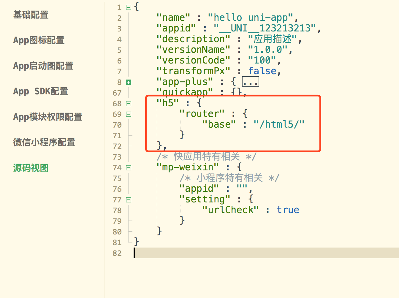 ├─manifest.json 配置应用名称、appid、logo、版本等打包信息,详见