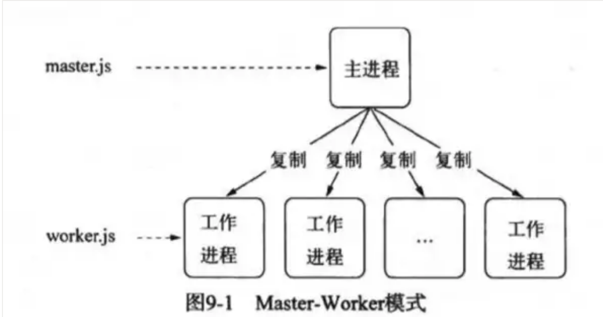 面对 node 单线程对多核 CPU 使用不足的情况,Node 提供了 child_process 模块,来实现进程的复制,node 的多进程架构是主从模式,如下所示: