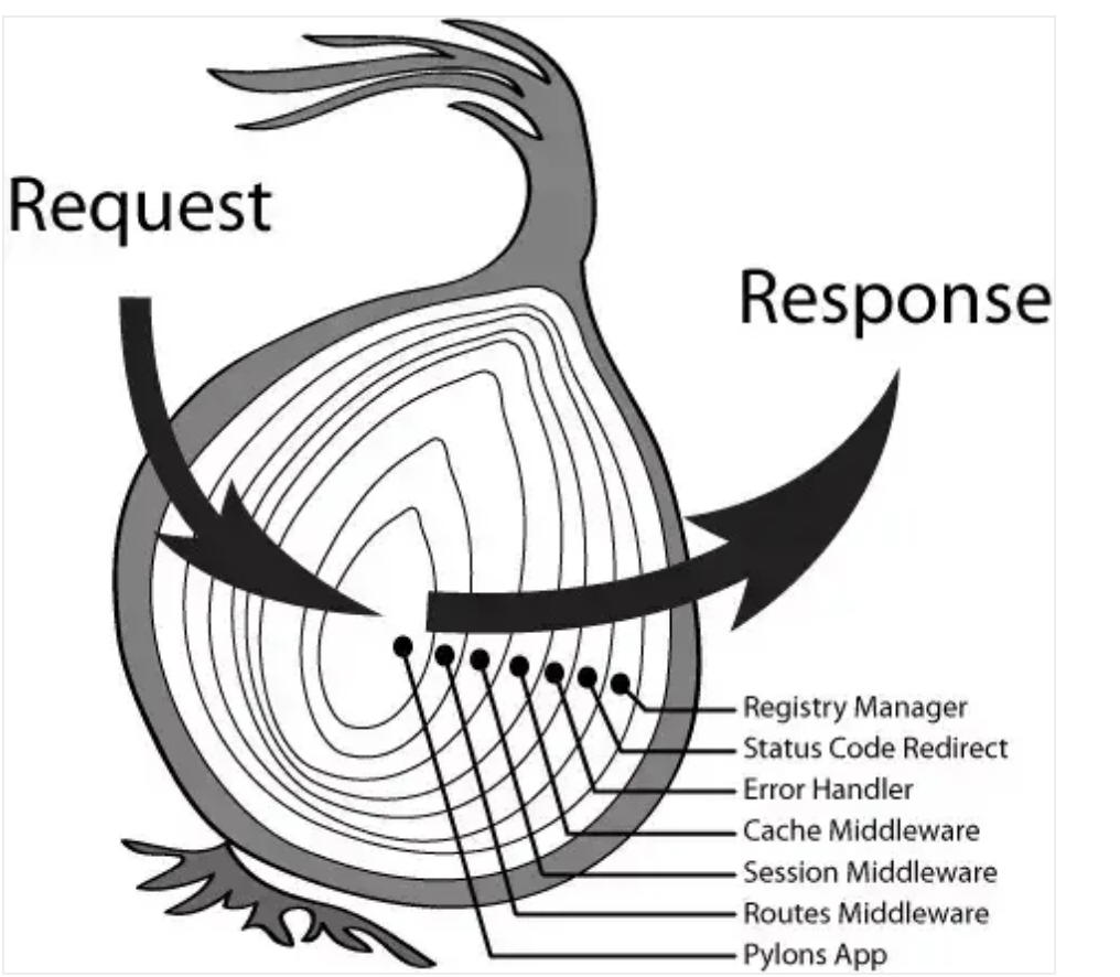 • 中间件执行就像洋葱一样,最早 use 的中间件,就放在最外层。处理顺序从左到右,左边接收一个 request,右边输出返回 response