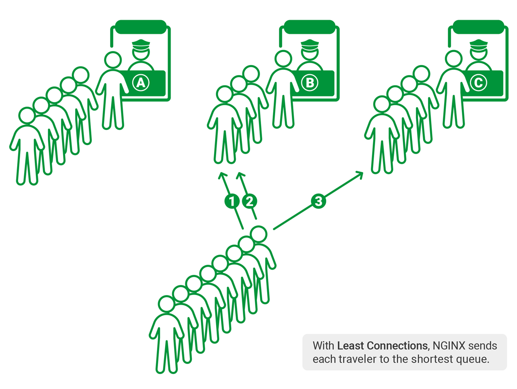 将请求优先分配给压力较小的服务器,它可以平衡每个队列的长度,并避免向压力大的服务器添加更多的请求。