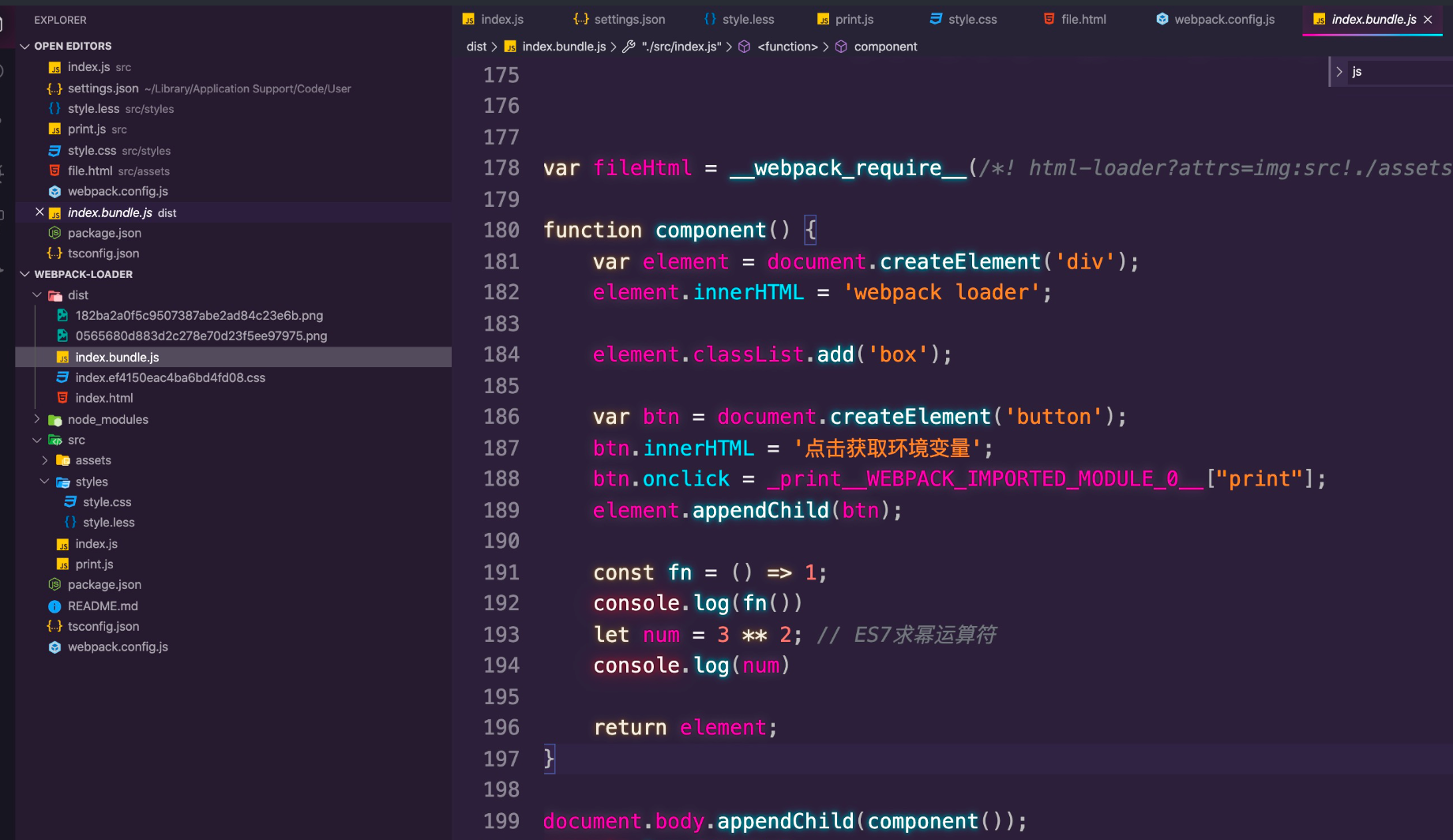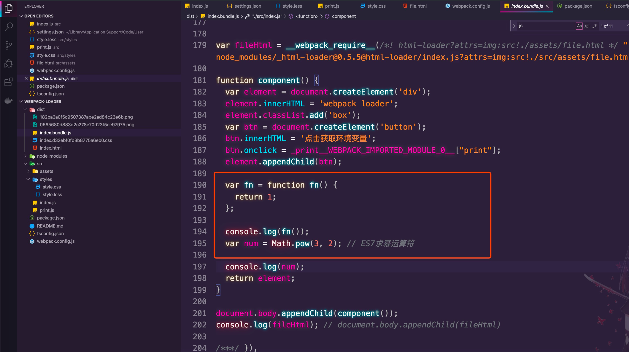 此时执行生产环境的打包命令, 可以看到在最终的bundle中看到生成的css文件.