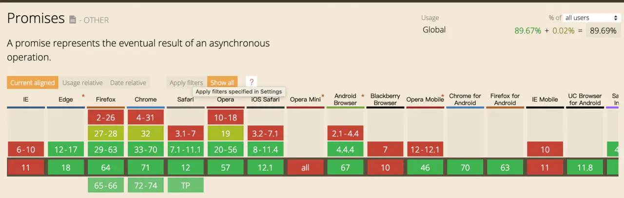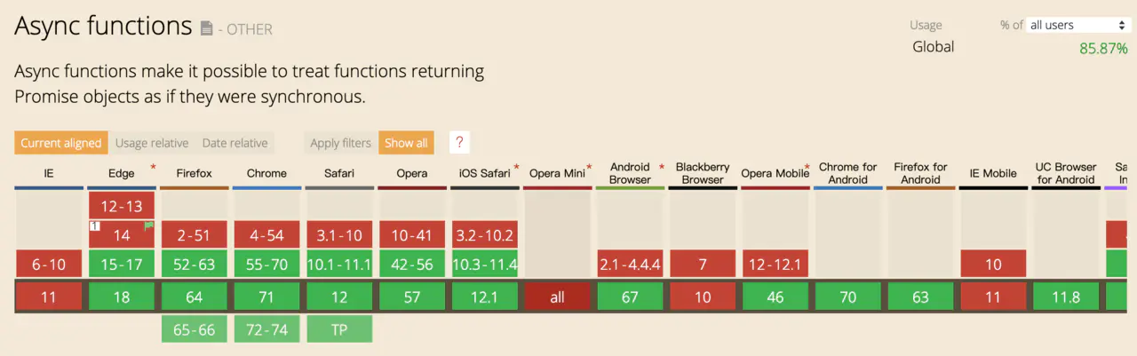 Promise 在 Chrome33 版本开始支持,全球用户比例89.69%, Async await 在 Chrome55 版本开始支持,全球用户比例85.87%。