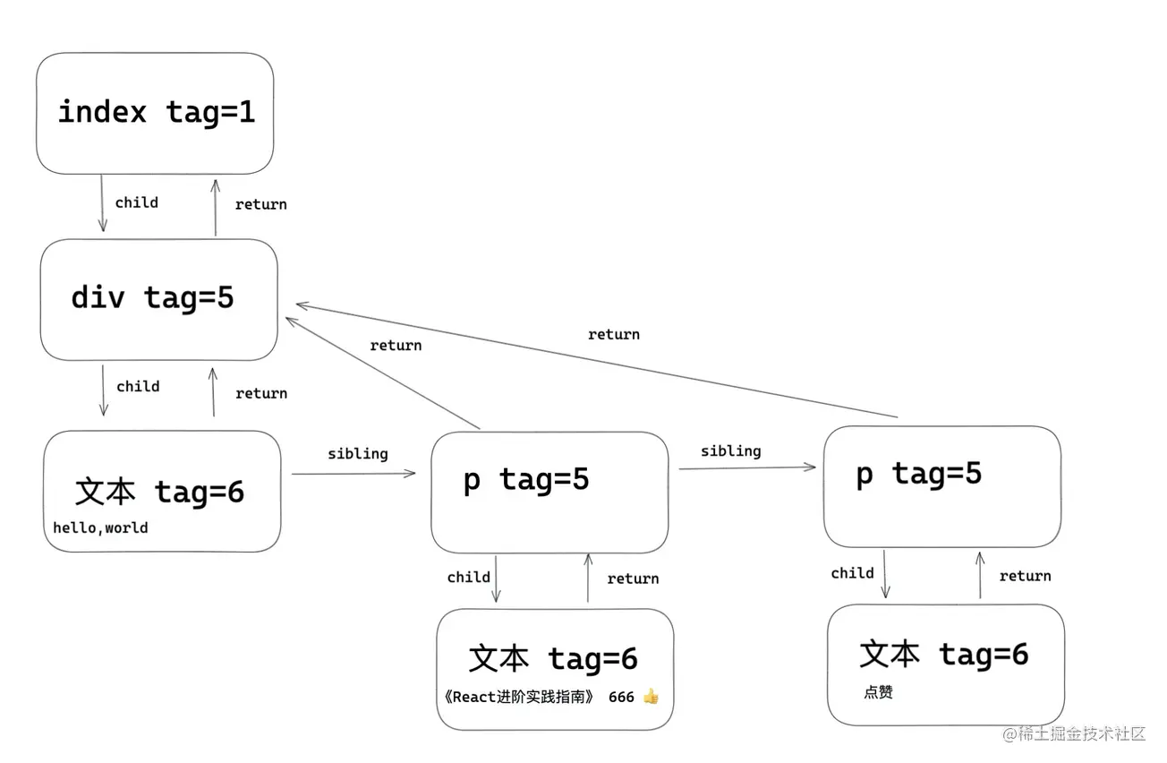 看过之前章节的朋友都知道对于每一个 element 都会对应一个 fiber ,每一个 fiber 是通过 return , child ,sibling 三个属性建立起联系的。