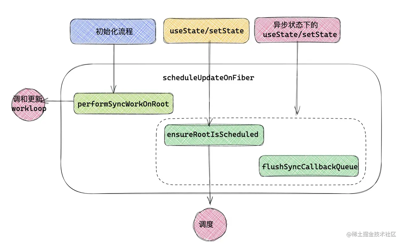 上面只保留了 dispatchAction 的核心逻辑,可以清楚的发现,无论是初始化,useState,setState 最后都是调用 scheduleUpdateOnFiber 方法。那么这个就是整个更新的入口。那么这个方法做了些什么事情呢?