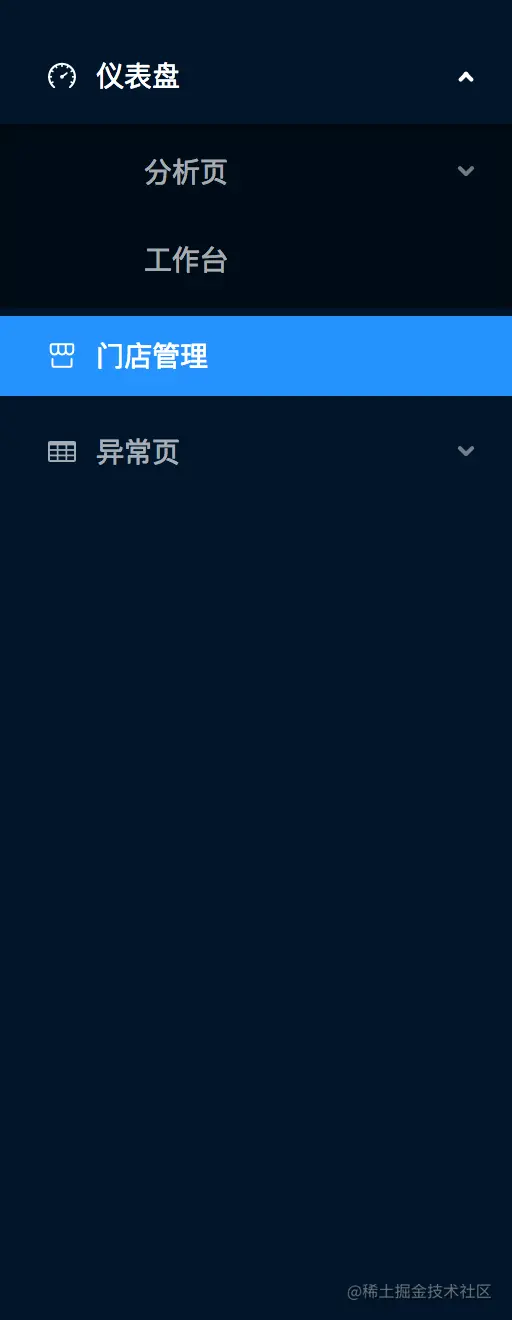 但对于一个父菜单来说,点击还意味着打开或关闭相应的子菜单,这就与点击跳转页面发生了冲突。为了简化这个问题,我们先统一菜单的交互为点击父菜单(包含 children 属性的菜单项)为打开或关闭子菜单,点击子菜单(不包含 children 属性的菜单项)为跳转至相应页面。