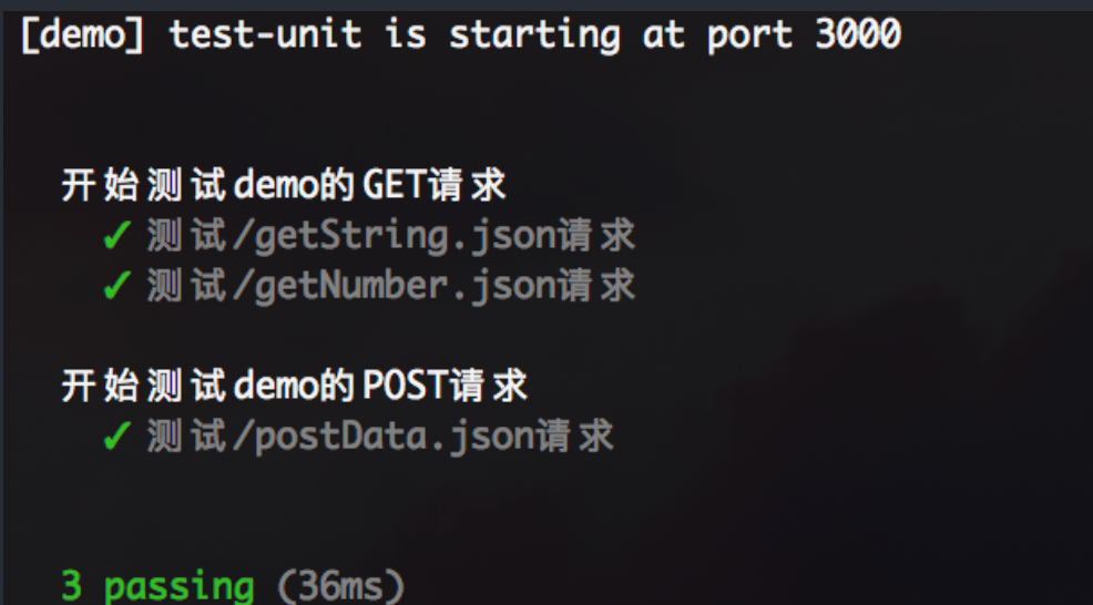 会自动读取执行命令 ./test 目录下的测用例文件 inde.test.js,并执行。测试结果如下