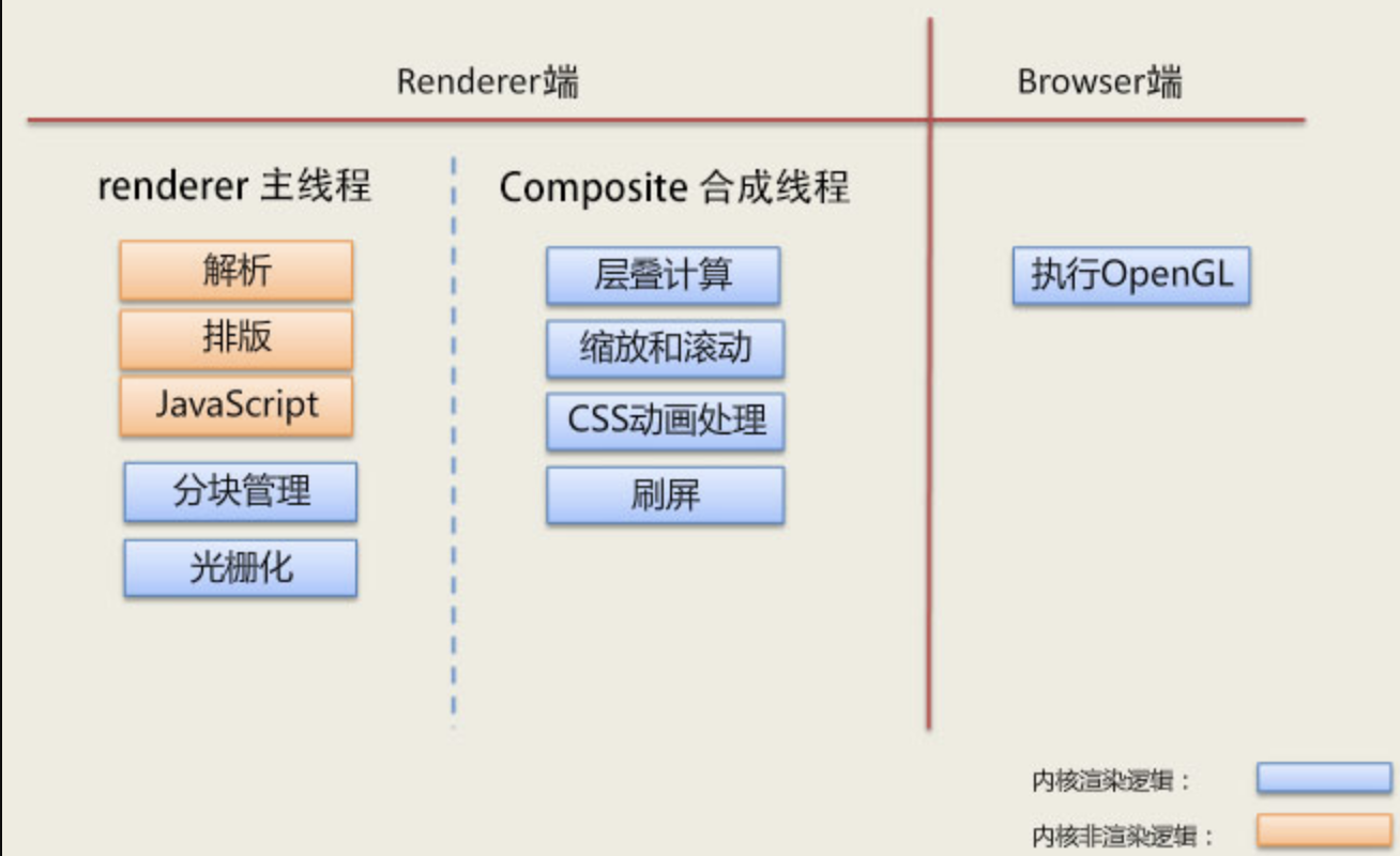 Chrome浏览器内核Blink渲染页面为例。对早期的Chrome浏览器而言,每个页面Tab对应一个独立的renderer进程,Renderer进程中包含了主线程和合成线程。早期Chrome内核架构