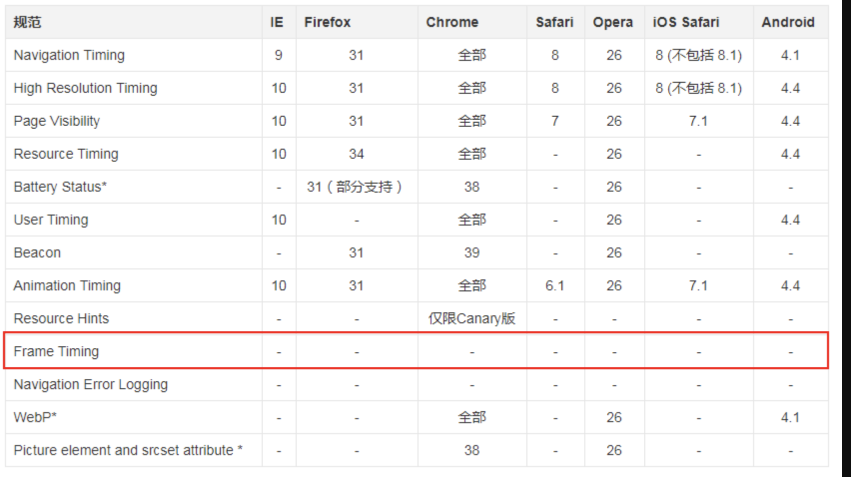 Frame Timing API虽好,但是,现在Frame Timing API的兼容性不算很友好,额,不友好到什么程度呢。还没有任何浏览器支持,处于实验性阶段,属于面向未来编程