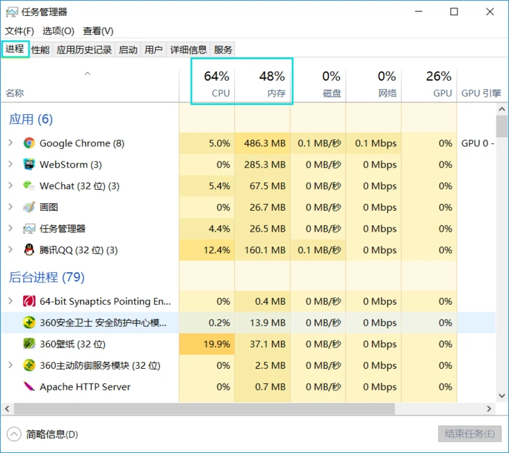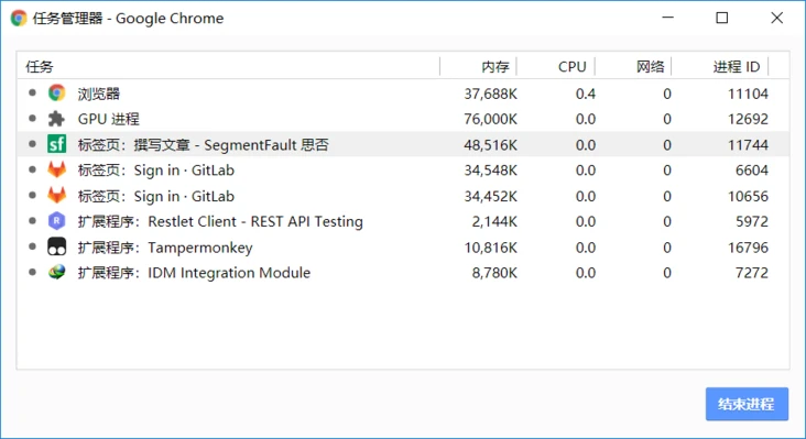 打开一个浏览器,可以看到:任务管理器出现了2个进程(一个主进程,一个是打开Tab页的渲染进程);