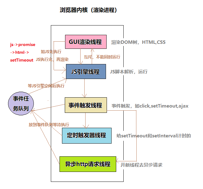 JS引擎执行代码块如setTimeout时(也可来自浏览器内核的其它线程,如鼠标点击,AJAX异步请求等),会将对应任务添加到事件线程中。 - 当对应的事件符合触发条件被触发时,该线程会把事件添加到待处理队列的队尾,等待