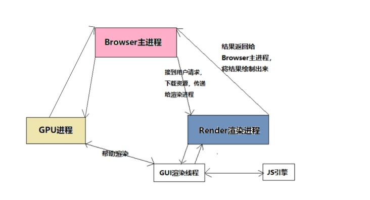 Browser主进程收到用户请求,首先需要获取页面内容(如通过网络下载资源),随后将该任务通过RendererHost接口传递给Render渲染进程Render渲染进程的Renderer接口收到消息,简单解释后,交给渲染线程GUI,然后开始渲染GUI渲染线程接收请求,加载网页并渲染网页,这其中可能需要Browser主进程获取资源和需要GPU进程来帮助渲染- 当然可能会有