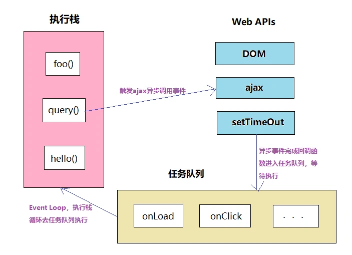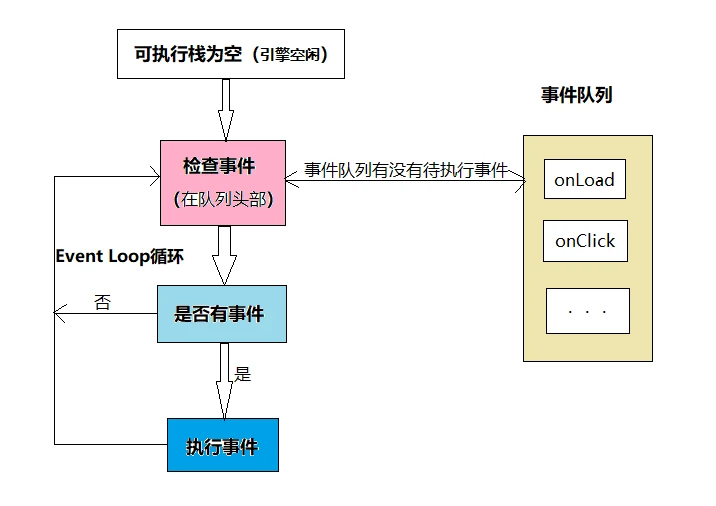 主线程在运行时会产生执行栈,栈中的代码调用某些api时,它们会在事件队列中添加各种事件(当满足触发条件后,如ajax请求完毕)。而当栈中的代码执行完毕,就会去读取事件队列中的事件,去执行那些回调,如此循环。