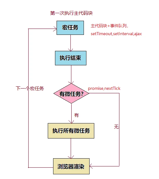 macrotask(又叫宏任务),主代码块,setTimeout,setInterval等(可以看到,事件队列中的每一个事件都是一个macrotask)- 可以理解是每次执行的代码就是一个宏任务(包括每次从事件队列中获取一个事件回调并放到执行栈中执行)