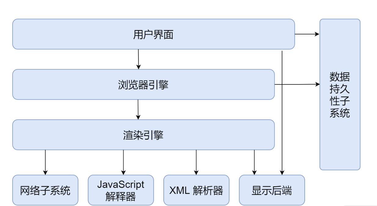 从结构上来说,浏览器主要包括了八个子系统:用户界面、浏览器引擎、渲染引擎、网络子系统、JavaScript 解释器、XML 解析器、显示后端、数据持久性子系统