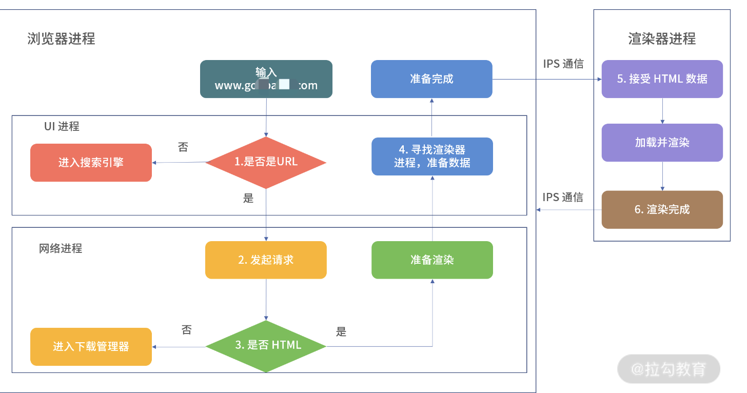 以上是用户在地址栏输入网站地址,到页面开始渲染的整体过程。为了方便理解,我帮你梳理了一个流程图: