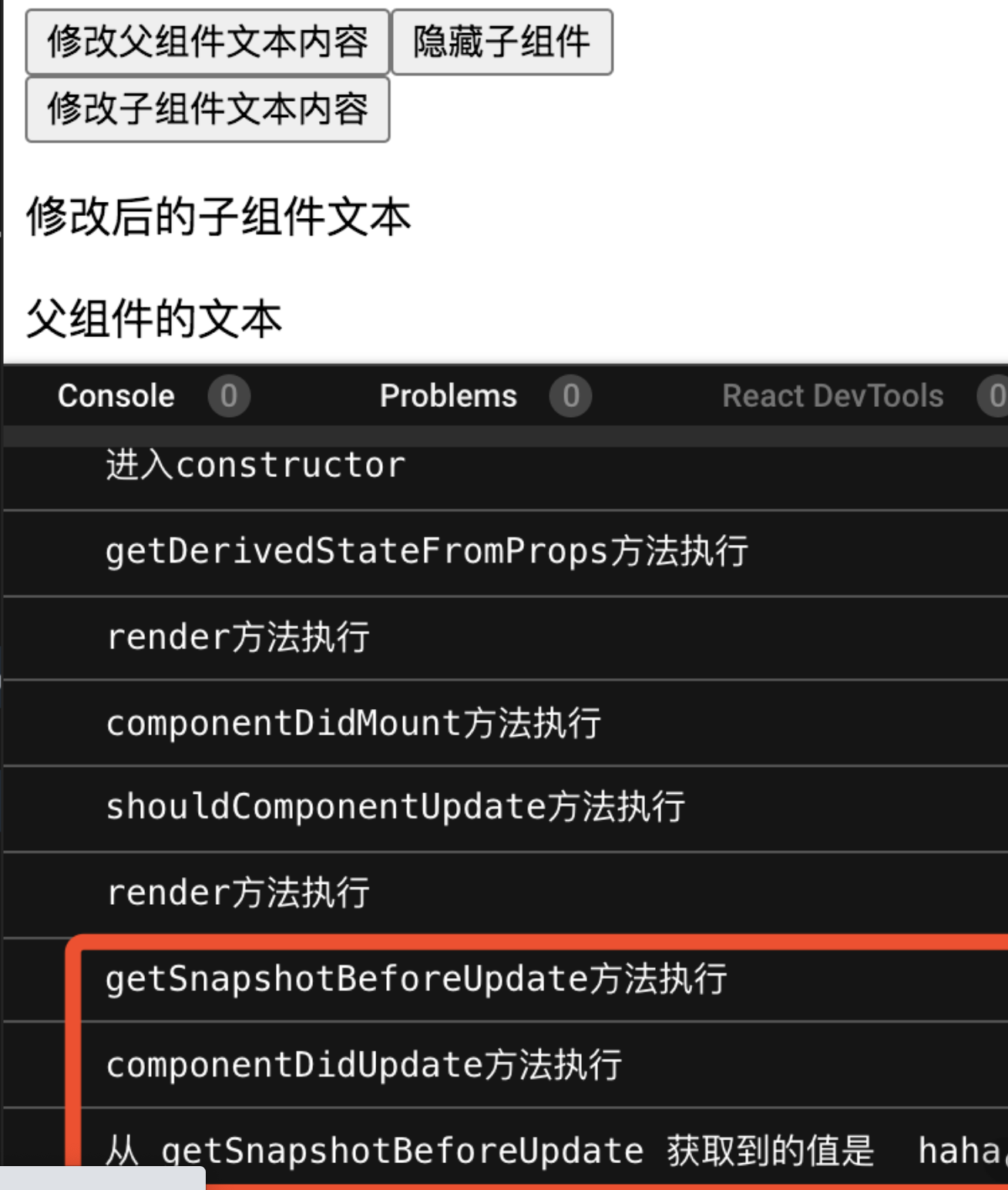 现在我们点击 Demo 界面上“修改子组件文本内容”按钮,就可以看到这两个生命周期的通信效果,如下图所示: