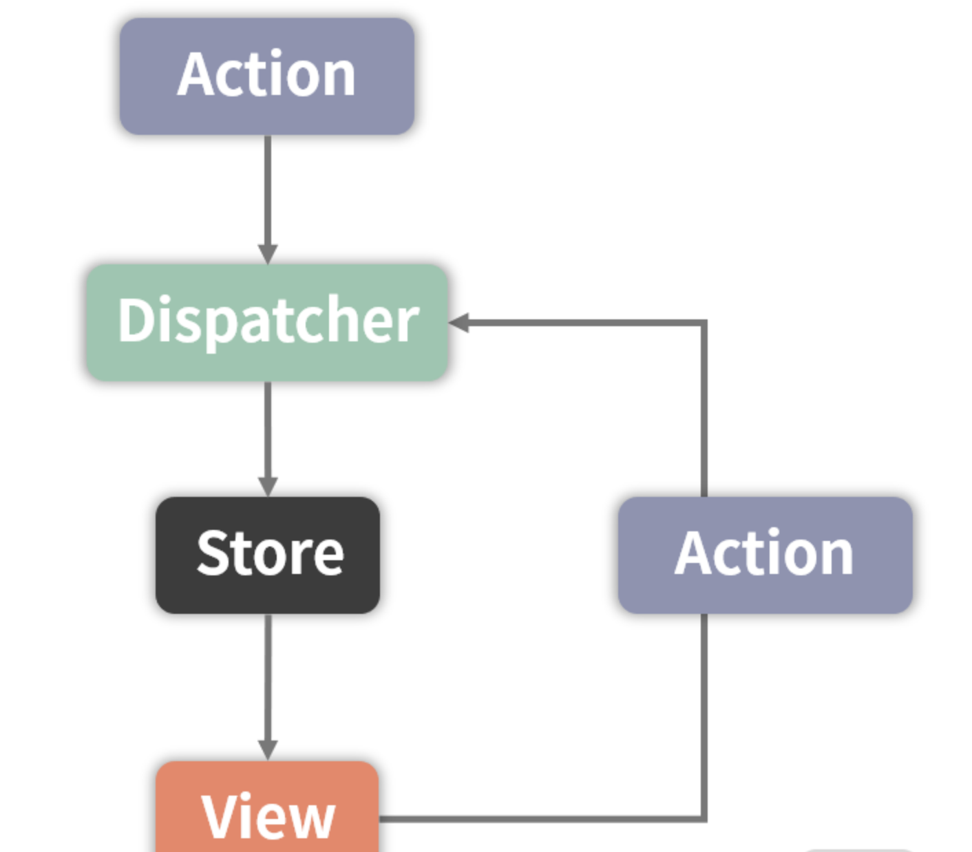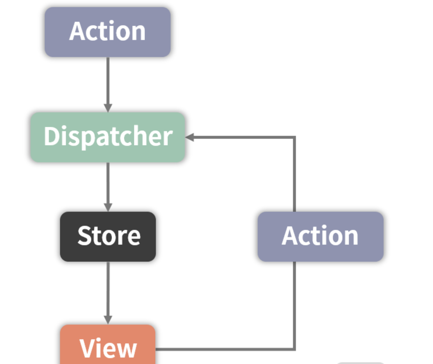 用户与 View 之间产生交互,通过 View 发起一个 Action;Dispatcher 会把这个 Action 派发给 Store,通知 Store 进行相应的状态更新。Store 状态更新完成后,会进一步通知 View 去更新界面。