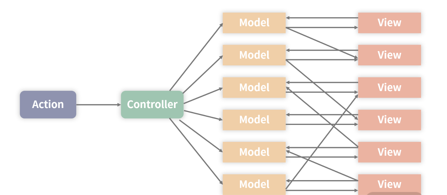 在如此复杂的依赖关系下,再小的项目变更也将伴随着不容小觑的风险——或许一个小小的改动,就会对整个项目造成“蝴蝶效应”般的巨大影响。如此混乱的修改来源,将会使得我们连 Bug 排查都无从下手,因为你很难区分出一个数据的变化到底是由哪个 Controller 或者哪个 View 引发的。