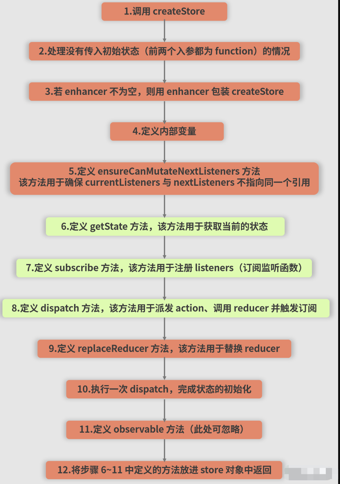 接下来我将 createStore 内部逻辑总结进一张大图中,这张图涵盖了每个核心方法的工作内容,它将帮助你快速把握 createStore 的逻辑框架。