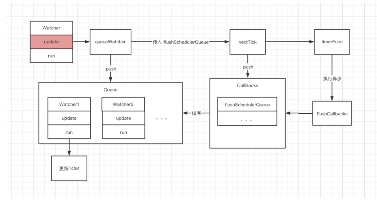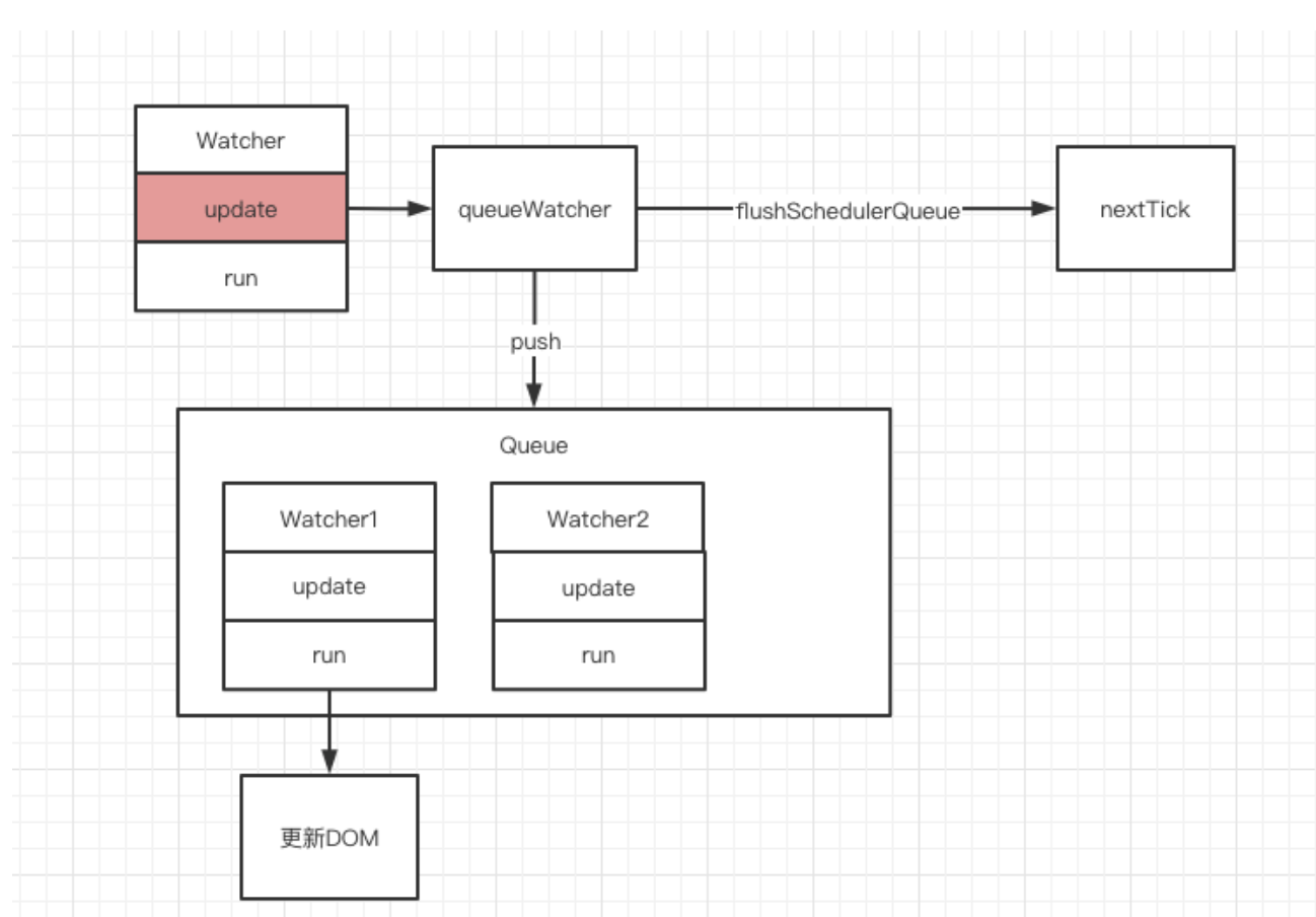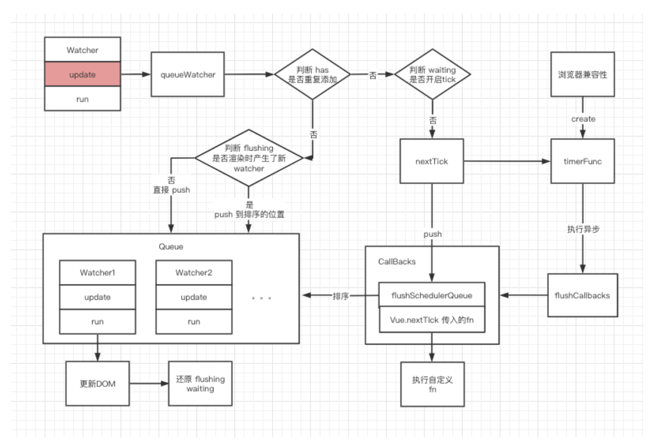 图中可以看到,Vue 在调用 Watcher 更新视图时,并不会直接进行更新,而是把需要更新的 Watcher 加入到 Queue 队列里,然后把具体的更新方法 flushSchedulerQueue 传给 nextTick 进行调用。