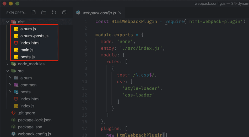 此时在我们的 dist 下就会额外生成一个 JS 文件,在这个文件中就是 index 和 album 中公共的模块部分了。