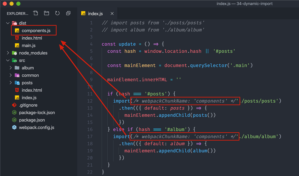 除此之外,魔法注释还有个特殊用途:如果你的 <chunk-name> 相同的话,那相同的 <chunk-name> 最终就会被打包到一起,例如我们这里可以把这两个 <chunk-name> 都设置为 components,然后再次运行打包,那此时这两个模块都会被打包到一个文件中,具体操作如下图所示: